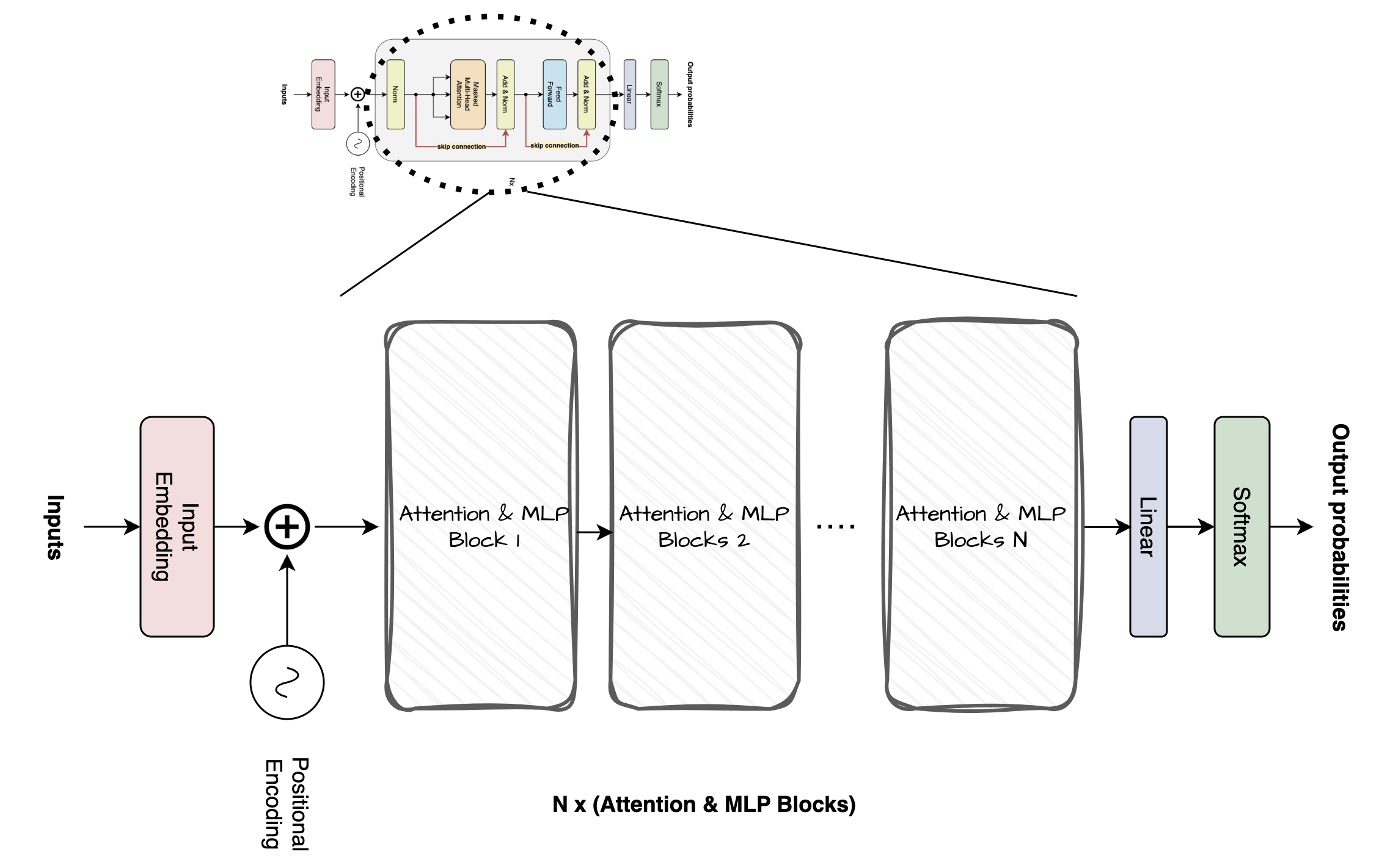 This gives the output of MLP block # denoted by above, notice the shape of MLP block it is same shape that we started with [6 x 768], this shape enables us to further pass this back to the transformer. The small Nx in the diagram denotes repetion of the Attention and MLP block block (hidden module) as shown below.