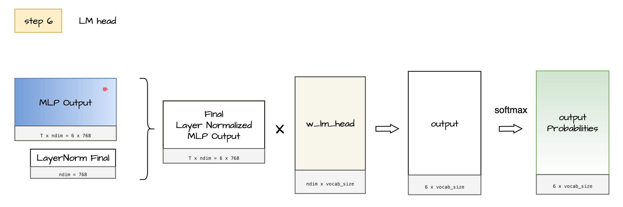 MLP Output goes through another projection here to get output which holds logits before they are converted into final probability scores. Each row of the in matrix [6 x 768] is probability distribution of which words are most likely to come next in the sequence. We can interpret the final output as follows.