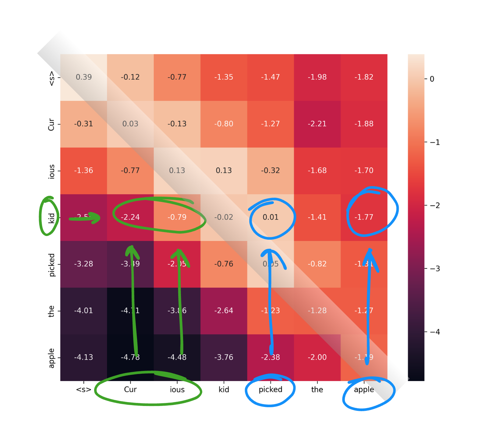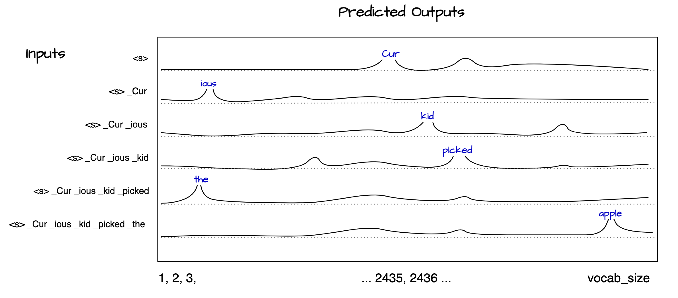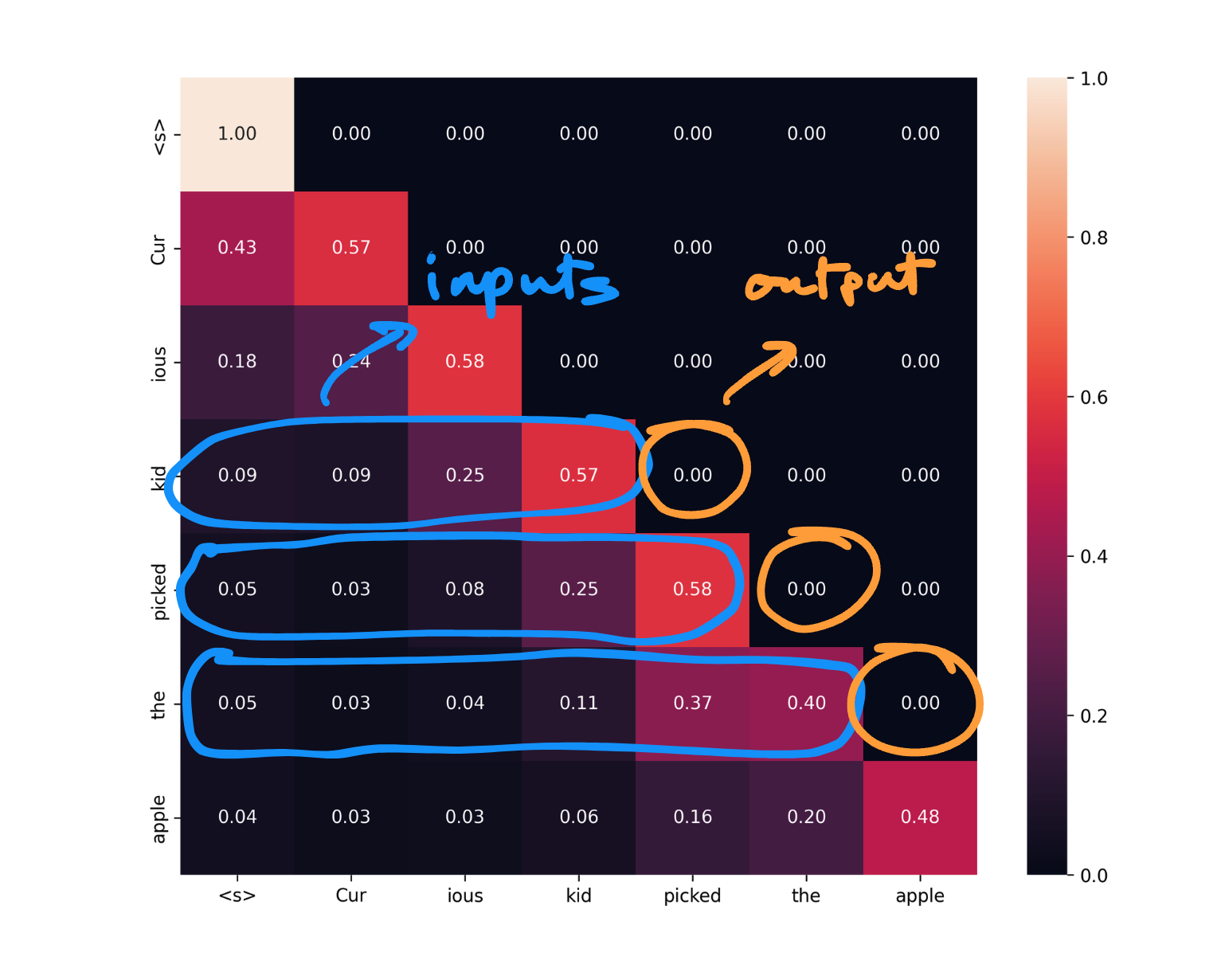 Same applies for other rows in the matrix, given tokens ["Cur", "ious", "kid", "picked"] predict ["the"] , and so on. One thing to note here is unline RNN or LSTM, calculation of losses can happen parallely (without having to wait for each timestep).