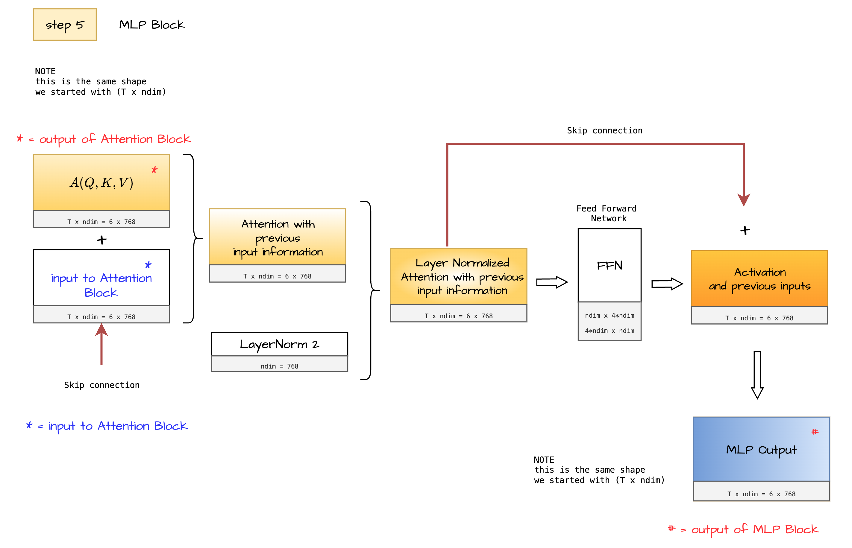 At the end of Attention and MLP blocks we get a matrix of shape [T x ndim] here [6 x 768].