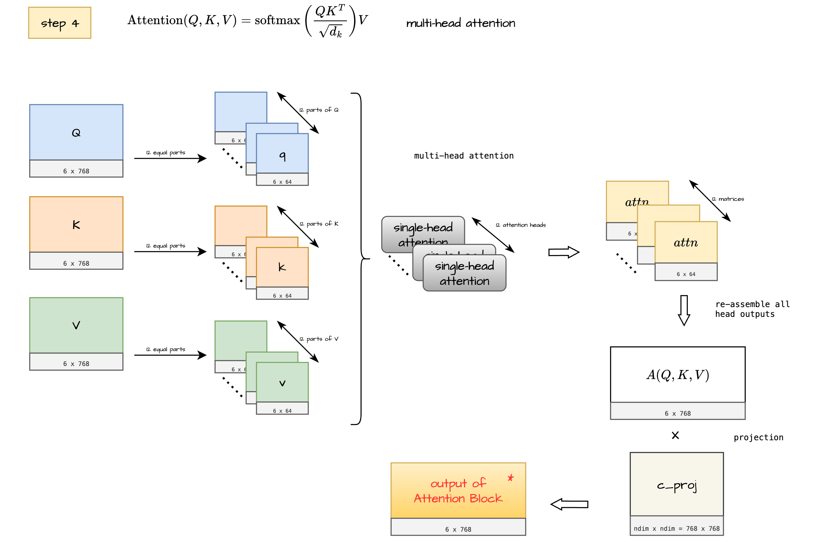 In Step 3 we saw how single head attention works, now do the same across 12 parts of Q, K, V matrices, we have multi-head attention.