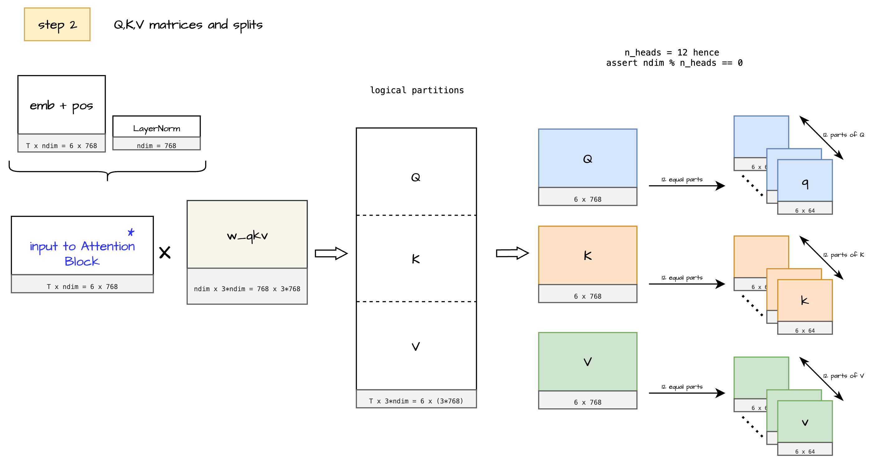 The model uses a single shared weight matrix, which is logically divided into separate parts for Q, K, and V. These divisions are shown as distinct matrices merely for easier visualization and understanding. Notice, the shape of w_qkv is [ndim x 3*ndim] , which on multiplying with input matrix [T x ndim] gives a [T x 3*ndim] shape resultant matrix.