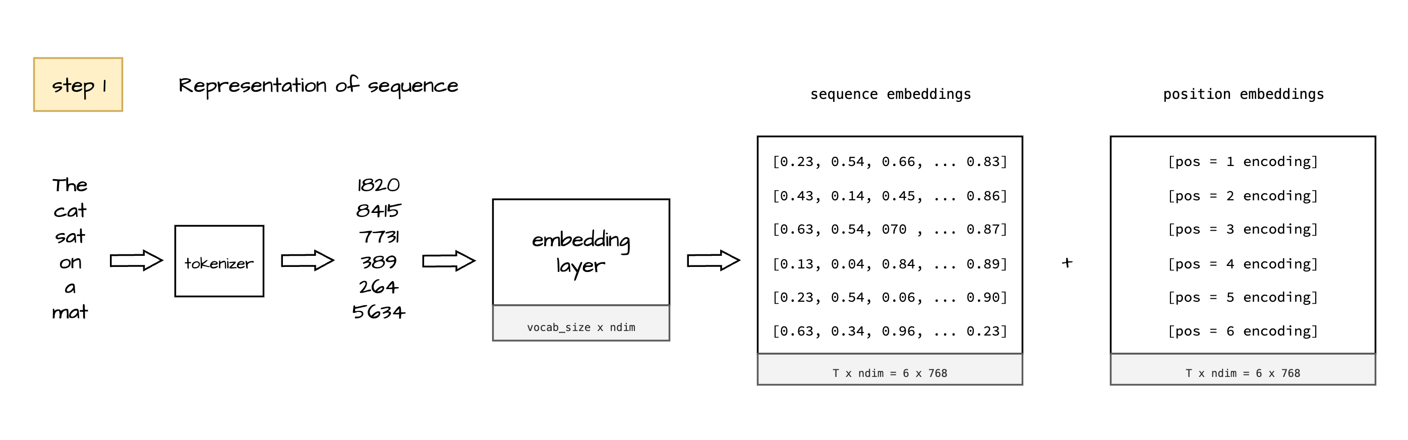 This is where any input sentence is converted to respective tokens using tokenizer and further converted to embeddings. Additionally we add a vector to each of the represented token to encode sequential information, there are multiple ways to get this vector for now we are skipping that.