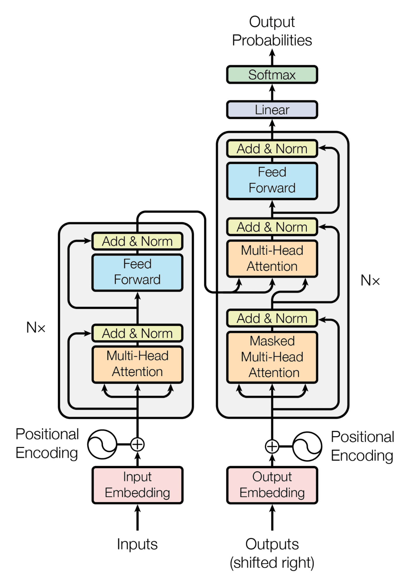 At its core, the Transformer consists of two main components: the encoder (represented by the grey block on the left) and the decoder (the grey block on the right).