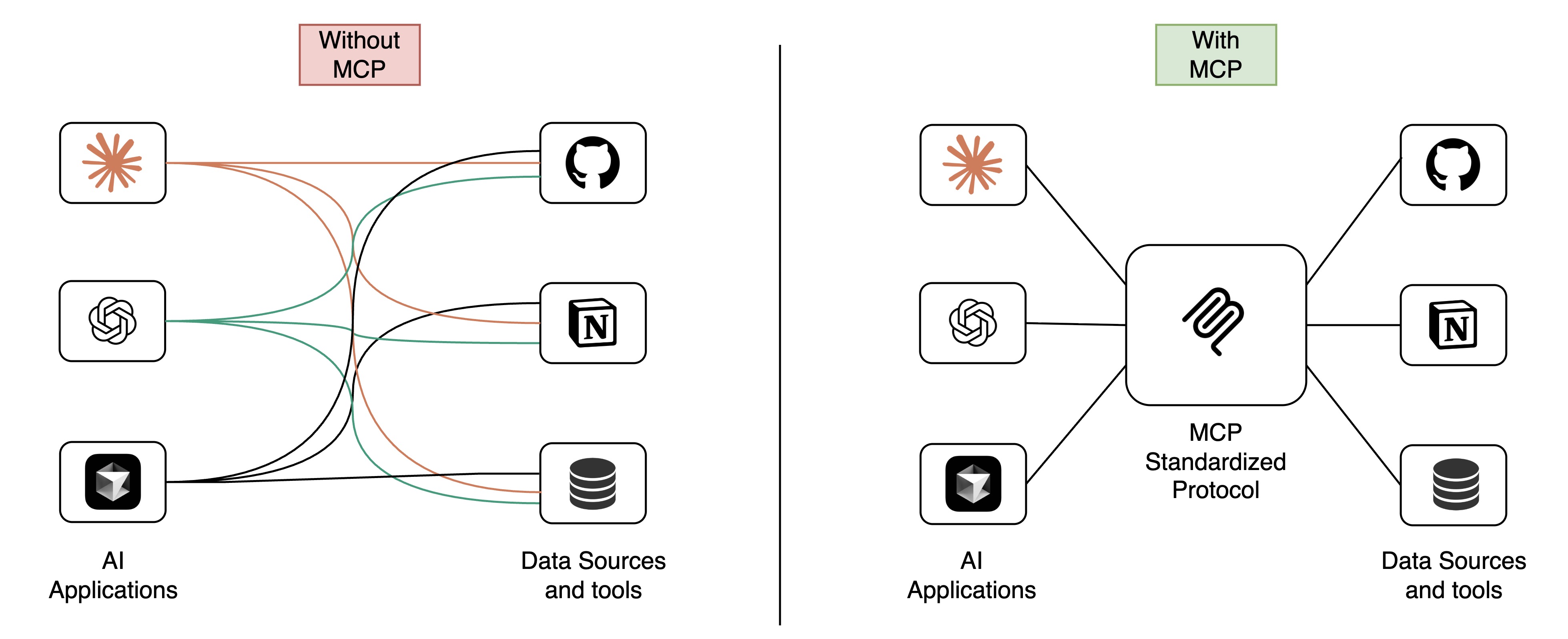 - M (AI applications) × N (data sources) = MxN (custom integrations)