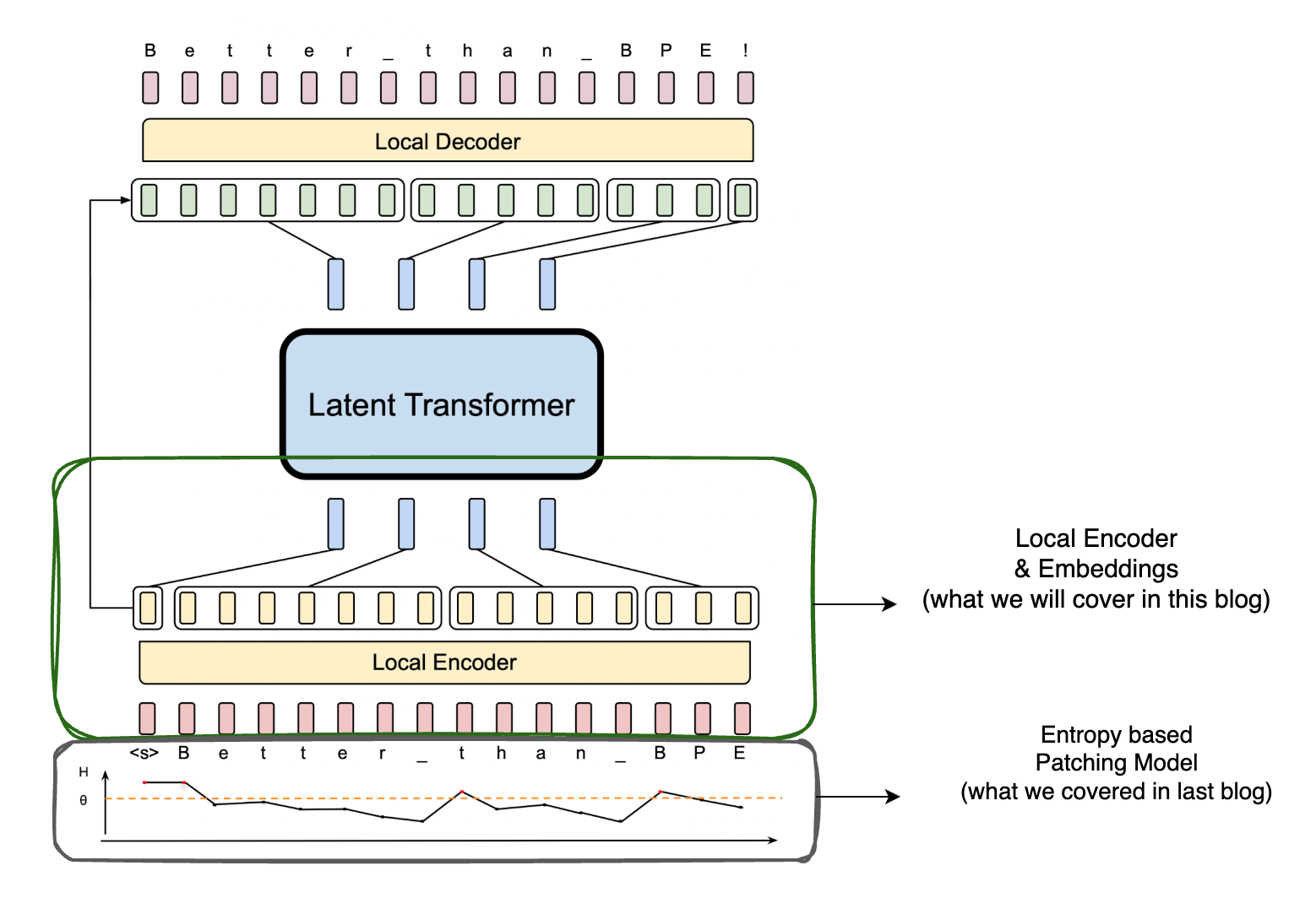 In the Part 1 of this series on BLT, we discussed about some prerequisites to understand Byte Latent Transformer. To summarize, BLT is a tokenizer-free architecture that matches tokenizer-based LLM performance at scale. We also saw how entropy-based patching converts the input text into a sequence of bytes.