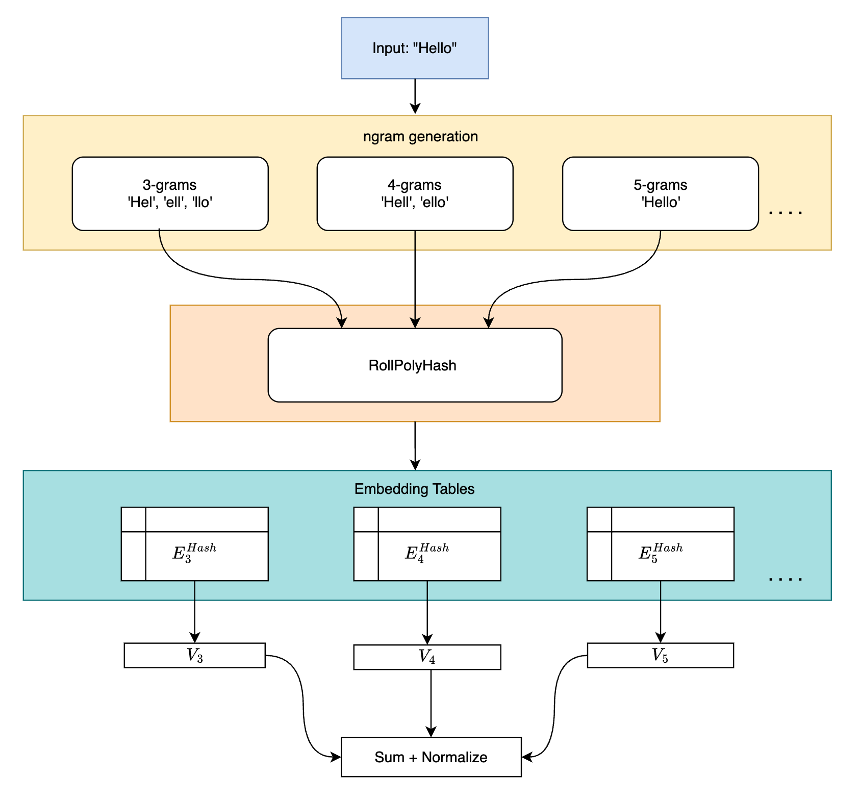 Here, is the embedding for the byte, is the byte embedding, is the hash embedding table for the -gram, and is the hash value for the -gram.