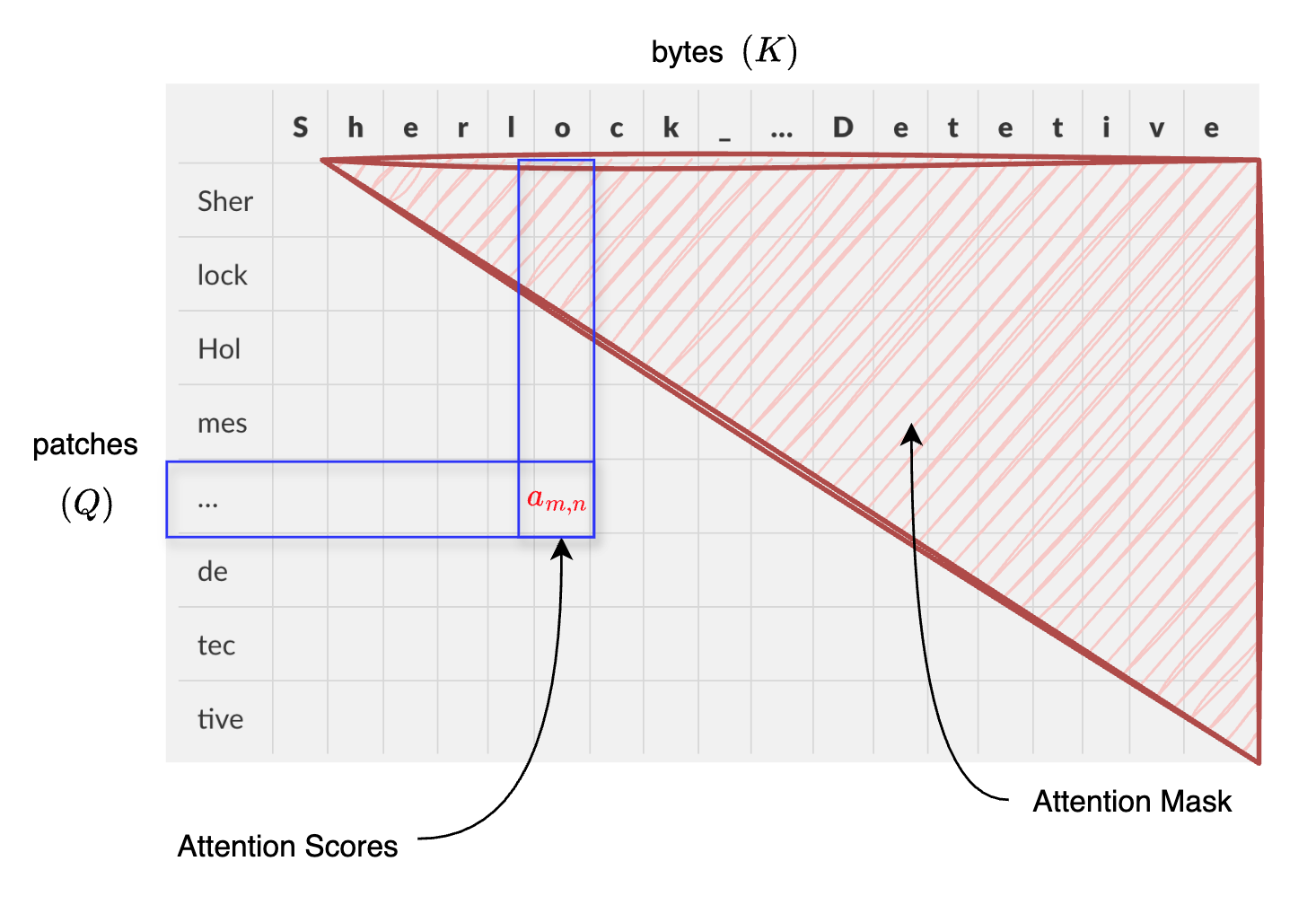 - We apply a masking operation to ensure that patches do not attend to bytes that are to be predicted next (area sketched in red in the above figure).