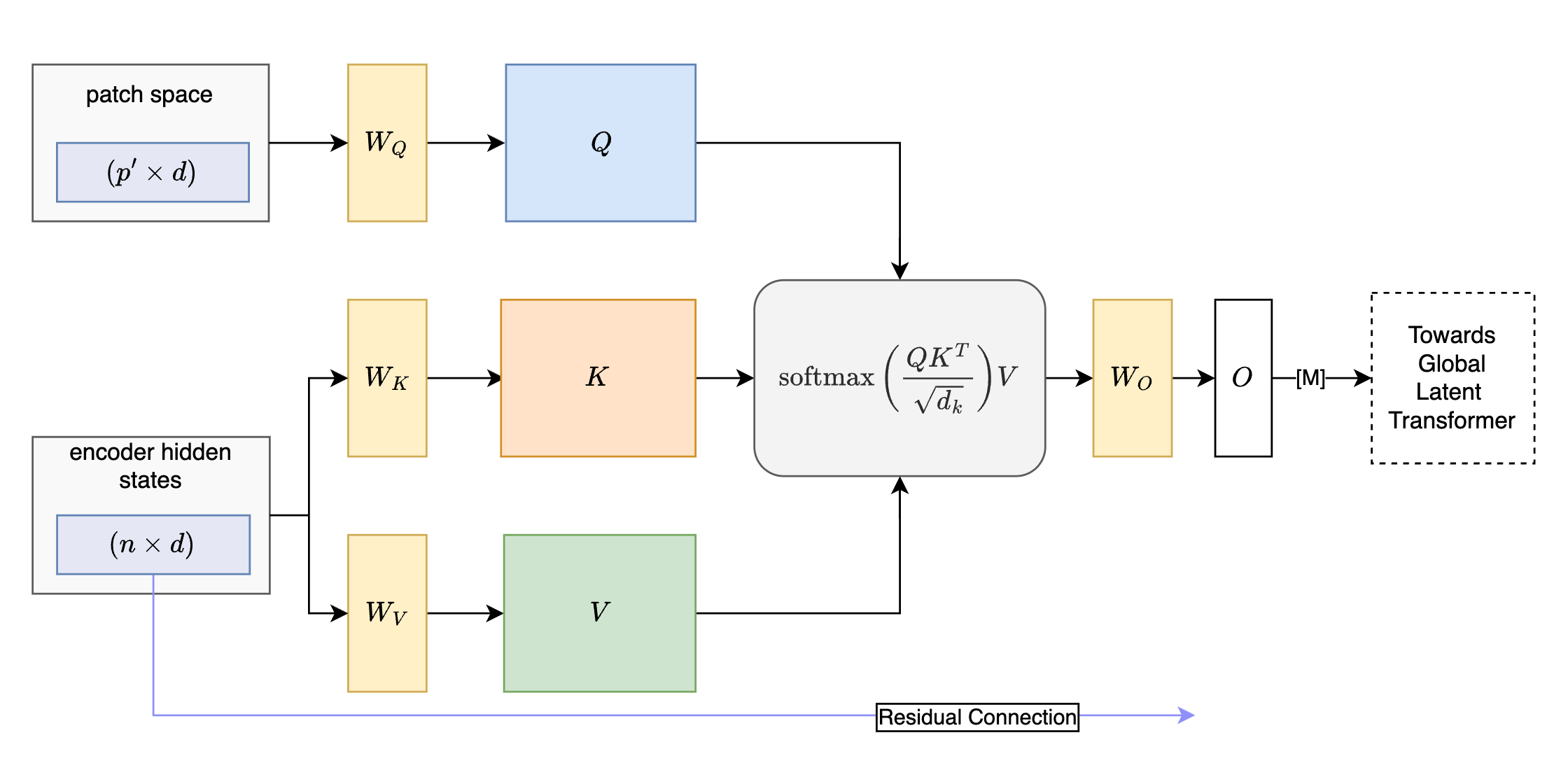 We get queries from patch space, keys and values are derived from the outputs of the local encoder. Let us pictorially look at how these are used in the local encoder to get attention scores.