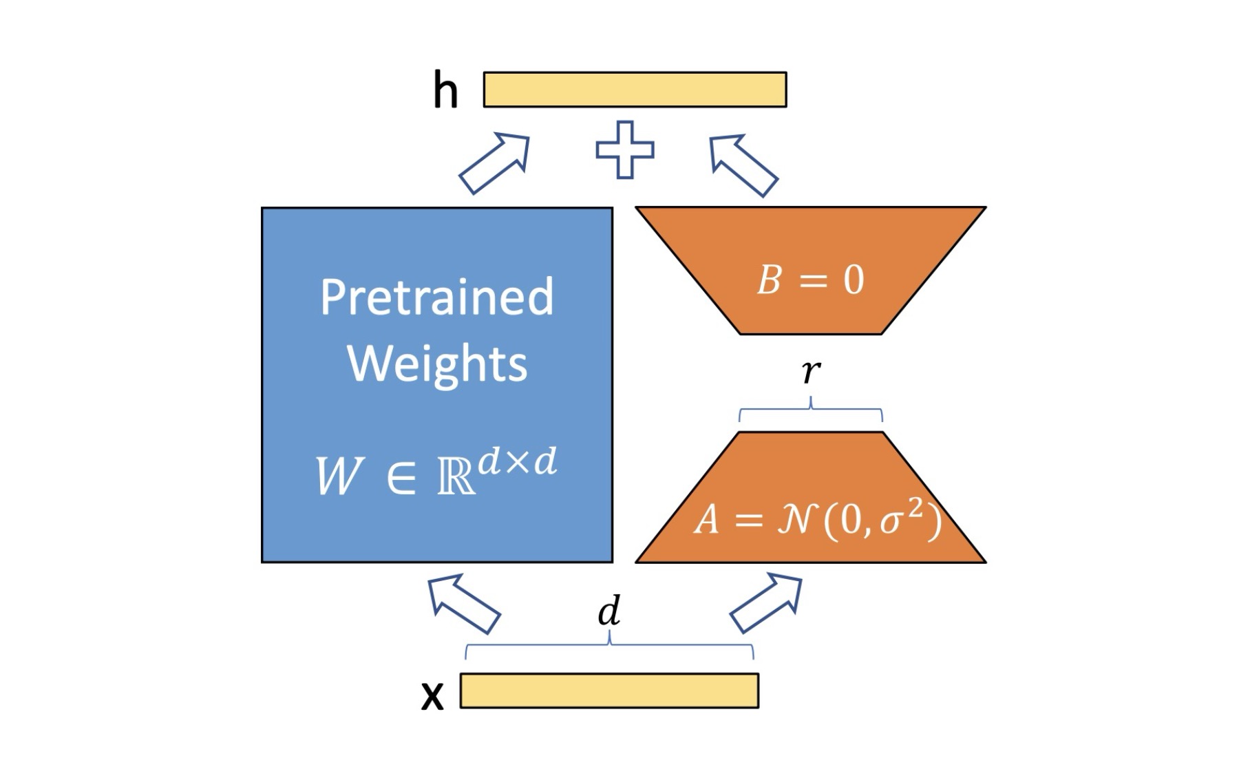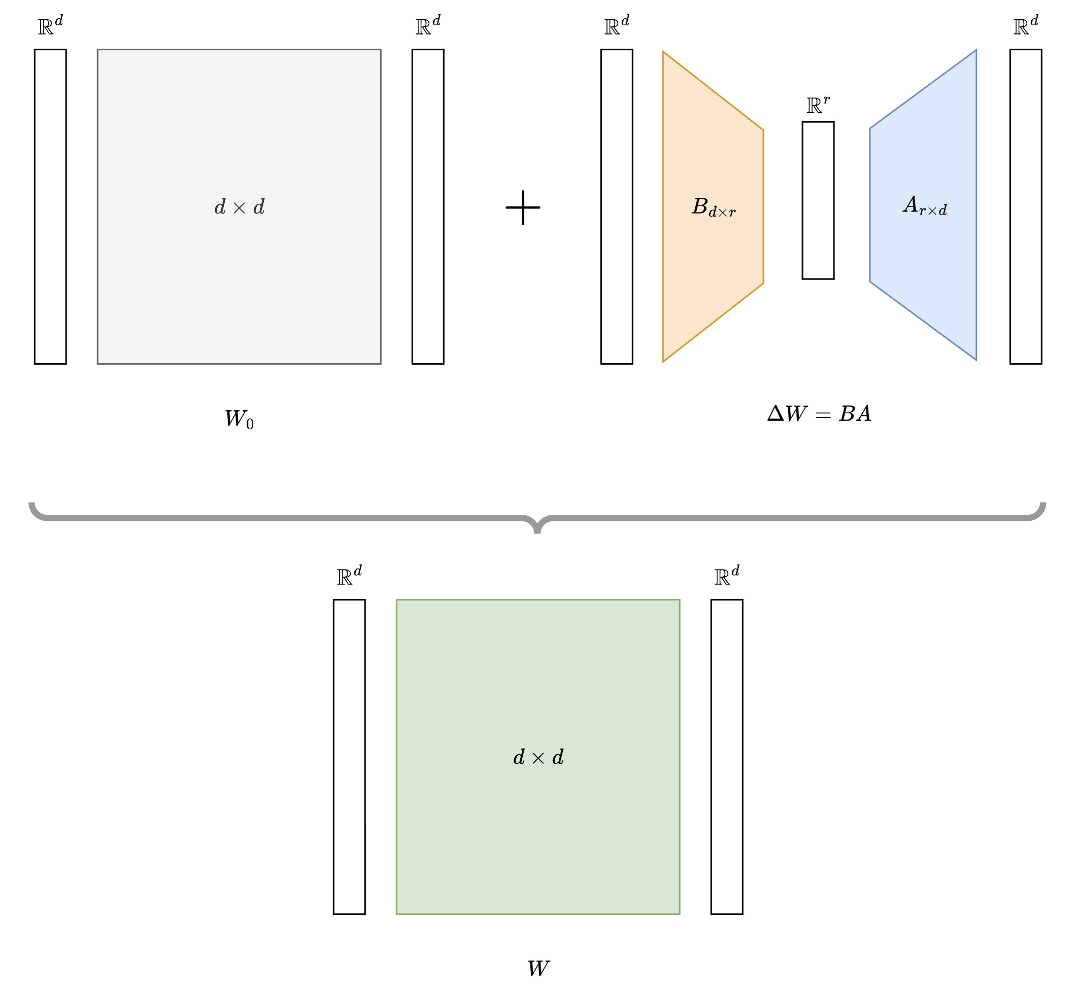 Where: $$ B \in \mathbb{R}^{d \times r}, \quad A \in \mathbb{R}^{r \times d}, \quad W_0 \in \mathbb{R}^{d \times d} $$