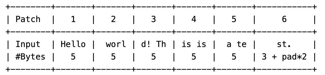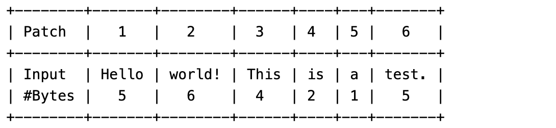 | Control | Can easily switch between patch sizes (16->32->64) based on hardware constraints | Coherent splitting of bytes (e.g maintains meaningful byte sequences) |