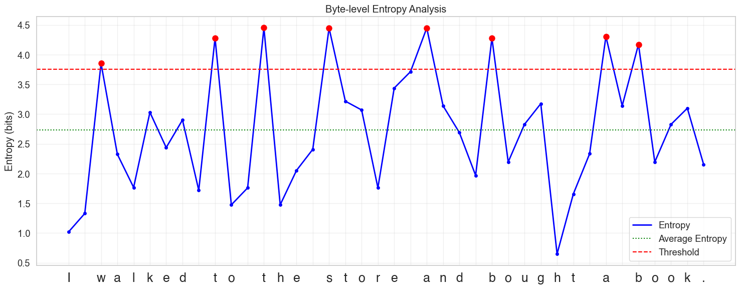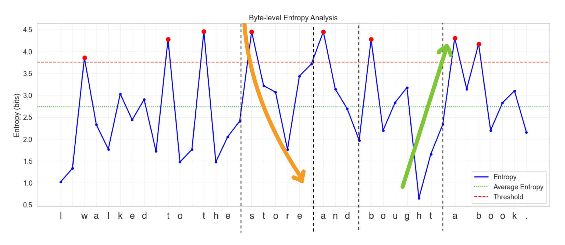 Let's try to see what patches are created using these methods seen in the previous section. I trained a small model (n-gram model with n=2) here to predict the entropy of the next byte given a byte sequence and plotted the patches created using the global constraint method and approximate monotonic constraint method.