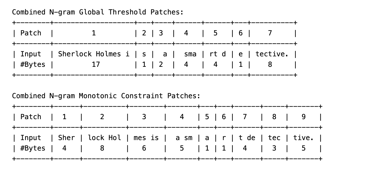- We can see this leads to inconsistent and non-contextual patching of similar byte sequences - for example, the same word could be split differently in different contexts