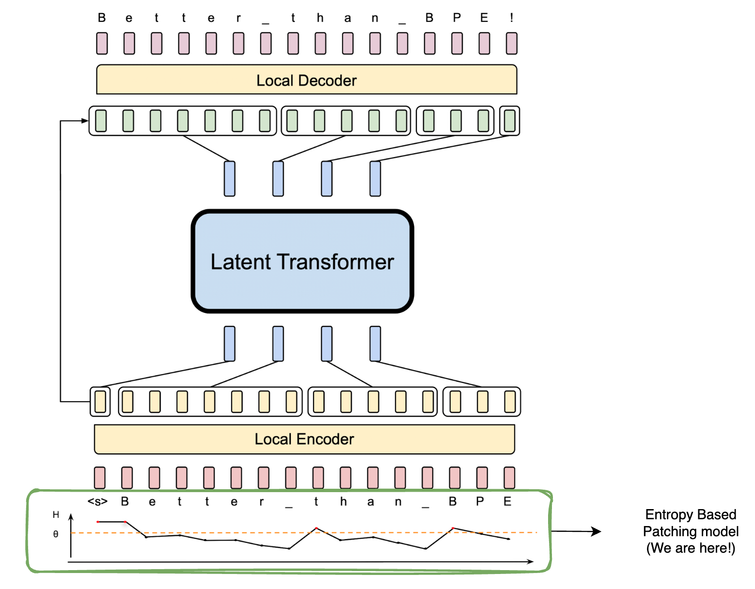 Additionally, this paper uses smart hacks to convert these dynamic patches to embeddings. It was important to establish the fact that patches of dynamic sizes can be created with entropy-based patching, and this can be achieved with simple models. The entropy-based patching model serves as an essential building block for BLT to achieve its performance.