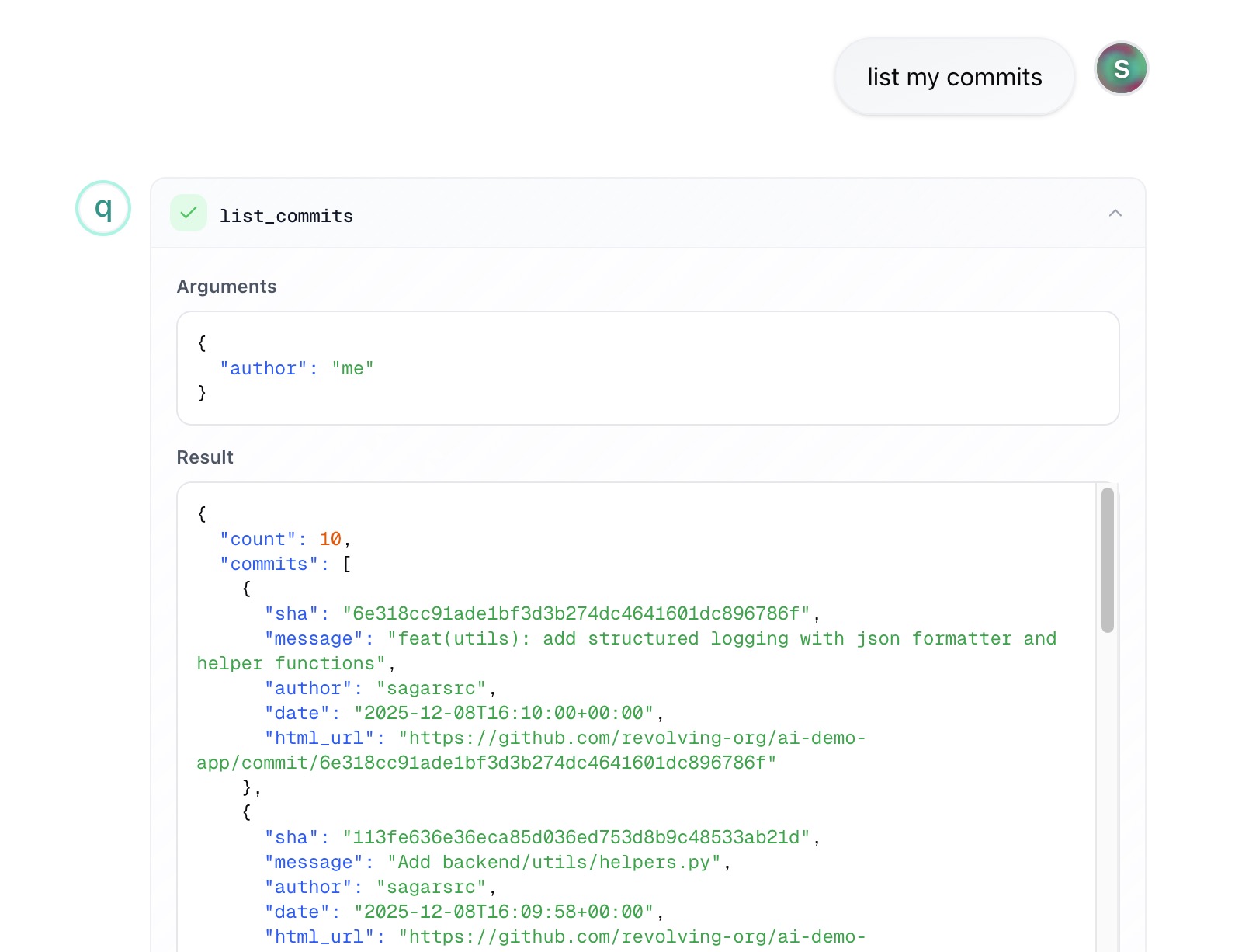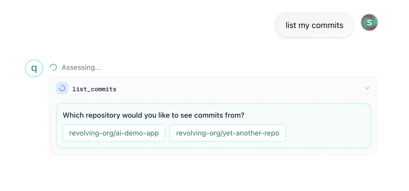 Notice how the user did not specify which repo to list commits from. This is where MCP comes in to get the user input for the list_commits tool.