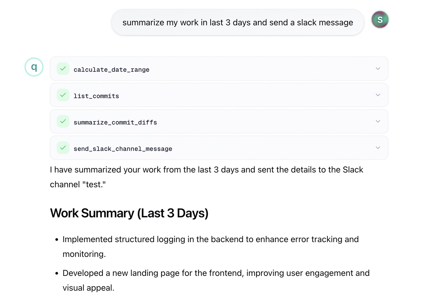 Think of it like this: Instead of jumping between GitHub to check commits, Slack to send updates, and your terminal to remember what you did in the last 2 days, you just ask Quick Call.