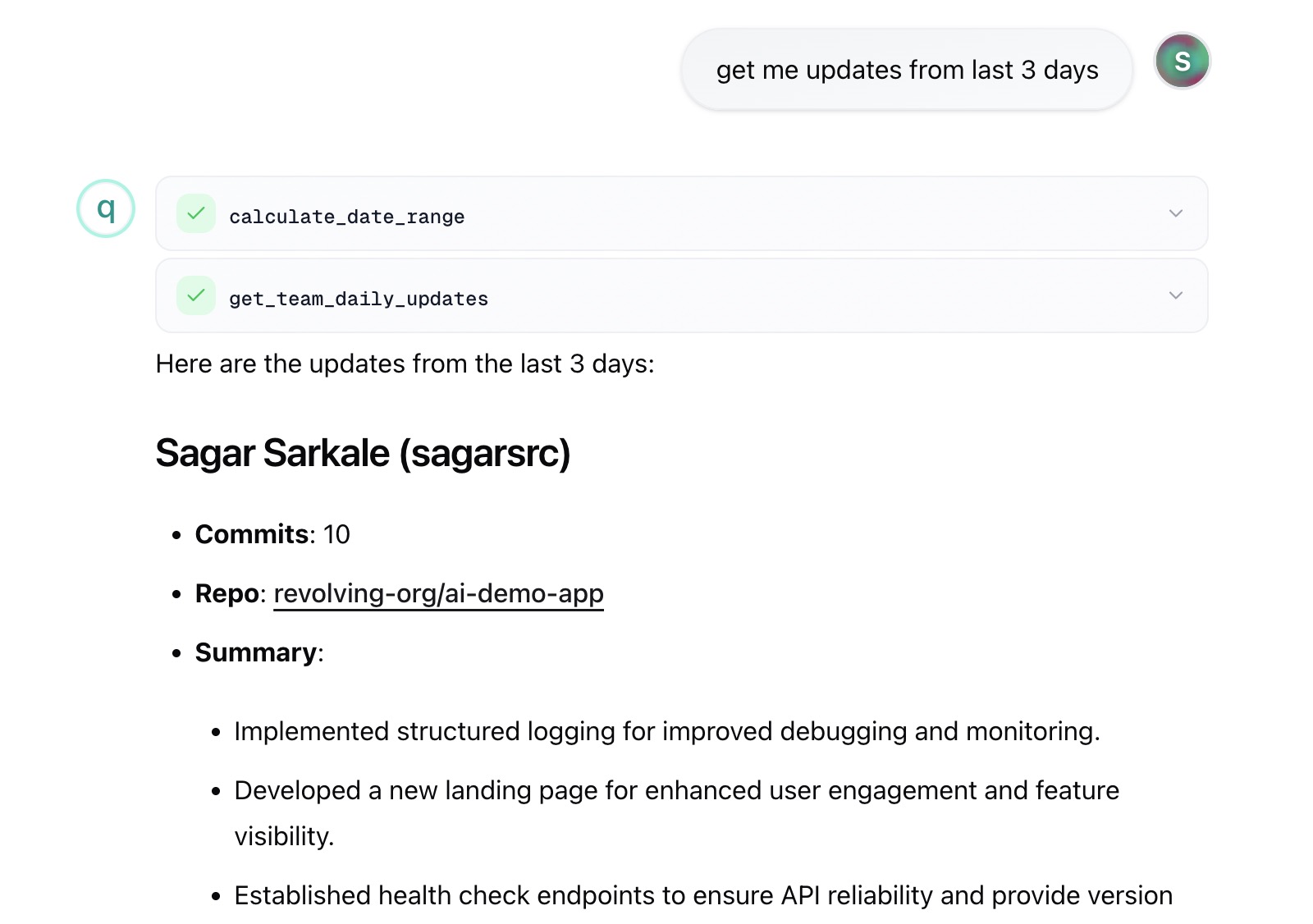 “Give me my daily update” -> It fetches your commits, analyzes the diffs, and tells you exactly what you shipped today.